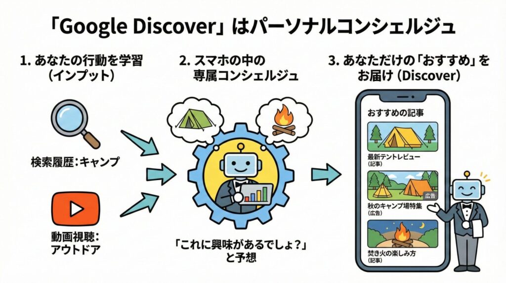スマホでGoogleアプリを開いたり、Chromeブラウザを開いたりした時、検索窓の下に「おすすめの記事」が勝手にズラッと並んでいませんか? あなたが過去に検索したことや、興味がありそうなニュースをGoogleが予想して表示してくれる、あの機能です。